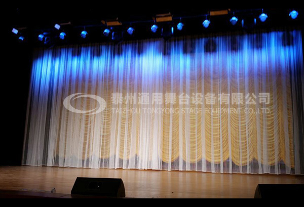 一般不作為場館的固定裝置,是以薄質(zhì)地帶有網(wǎng)狀孔眼的棉布或化纖材料制成的半透明幕布。除本身所具有的輕薄,打摺后可以制作成各種裝飾幕特點以外,還具有一定的透光作用。舞臺上常用白紗幕、黑紗幕、紗畫幕表現(xiàn)場景環(huán)境,從紗畫幕后面向景物投光可以顯現(xiàn)隱藏在后面的人物和空間環(huán)境,從而且易于表現(xiàn)夢幻、回憶的虛擬場面;從前面向紗幕投光可以表現(xiàn)渲染紗畫幕上所畫的形象;從紗幕背面向紗幕投光時,紗畫幕前面所畫的形象看起來則不復(fù)存在。